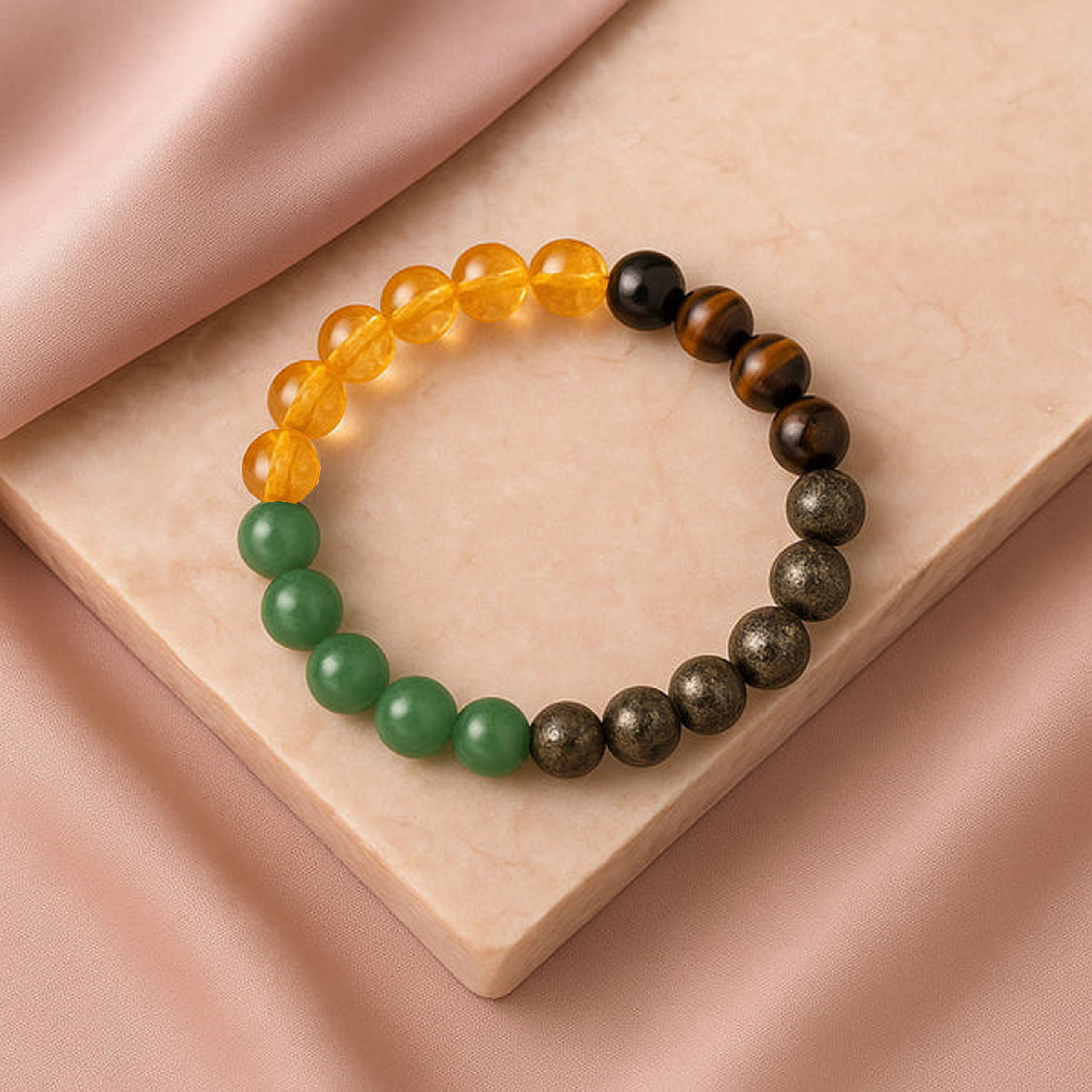 The bracelet has a majority of natural stones known for their metaphysical properties and purposely picked for resources and prosperity. Similarly, just like citrine, pyrite, and green aventurine are known to align universal energy and shape the well-being of mind and body; it is a foundation for a joyful world.