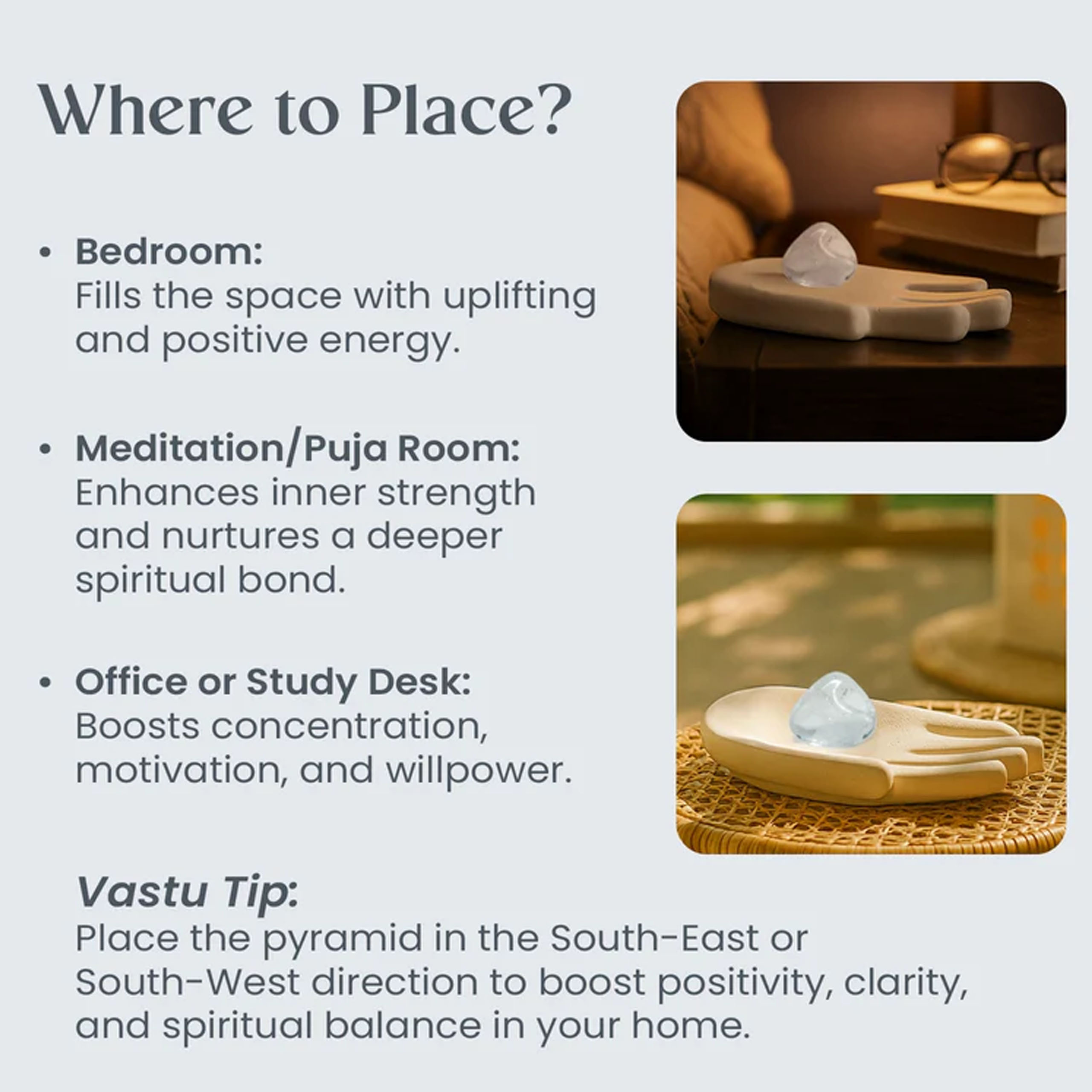 Vastu Tip: Place the pyramid in the South-East or South-West direction to boost positivity, clarity, and spiritual balance in your home.