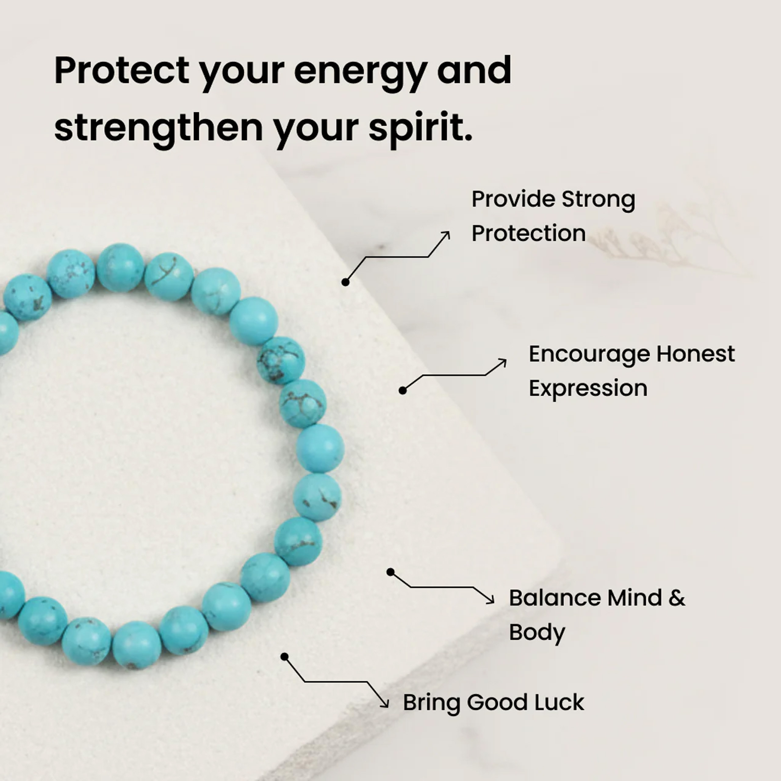 Turquoise is a purification stone. It dispels negative energy and can be worn to protect against outside influences or pollutants in the atmosphere.